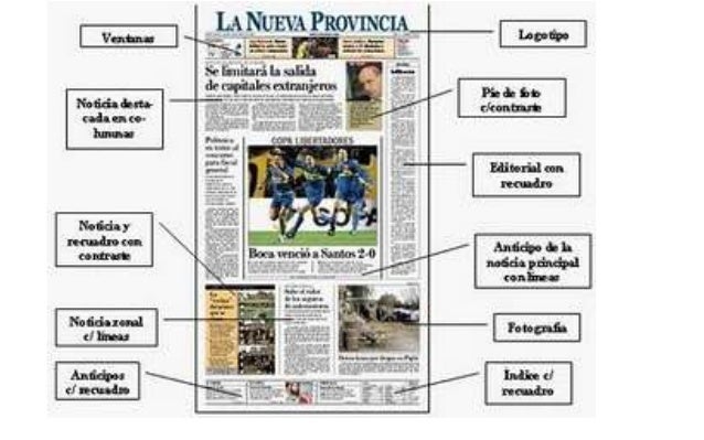 Títulos o titulares — desde el titular de la primera página, hasta los titulares menores de artículos. Son subdivididos en: